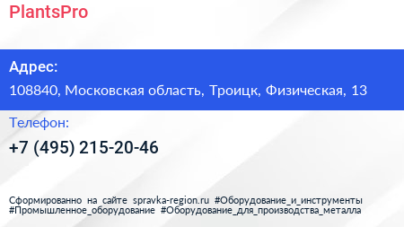 PlantsPro по адресу 108840, Московская область, Троицк, Физическая, 13 в дальнейшем Организация, размещена в следующих категориях: