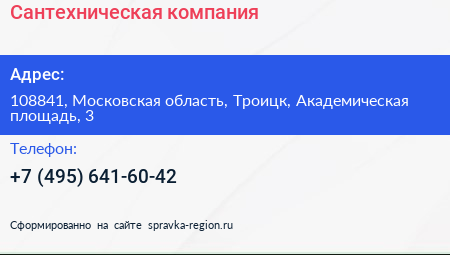 Сантехническая компания по адресу 108841, Московская область, Троицк, Академическая площадь, 3 в дальнейшем Организация, размещена в следующих категориях: