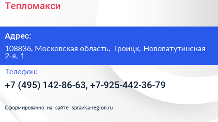 Тепломакси по адресу 108836, Московская область, Троицк, Нововатутинская 2-я, 1 в дальнейшем Организация, размещена в следующих категориях: