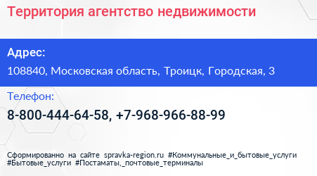 Территория, агентство недвижимости по адресу 108840, Московская область, Троицк, Городская, 3 в дальнейшем Организация, размещена в следующих категориях:
