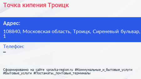 Точка кипения-Троицк по адресу 108840, Московская область, Троицк, Сиреневый бульвар, 1 в дальнейшем Организация, размещена в следующих категориях: