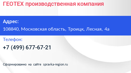 ГЕОТЕХ, производственная компания по адресу 108840, Московская область, Троицк, Лесная, 4а в дальнейшем Организация, размещена в следующих категориях: