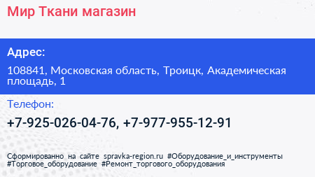 Мир Ткани, магазин по адресу 108841, Московская область, Троицк, Академическая площадь, 1 в дальнейшем Организация, размещена в следующих категориях: