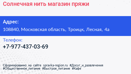 Солнечная нить, магазин пряжи по адресу 108840, Московская область, Троицк, Лесная, 4а в дальнейшем Организация, размещена в следующих категориях: