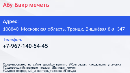 Абу-Бакр, мечеть по адресу 108840, Московская область, Троицк, Вишнёвая 8-я, 347 в дальнейшем Организация, размещена в следующих категориях: