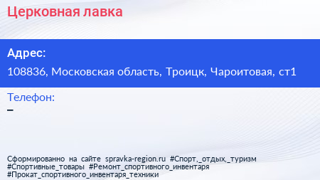 Церковная лавка по адресу 108836, Московская область, Троицк, Чароитовая, ст1 в дальнейшем Организация, размещена в следующих категориях: