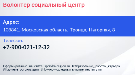Волонтер, социальный центр по адресу 108841, Московская область, Троицк, Нагорная, 8 в дальнейшем Организация, размещена в следующих категориях:
