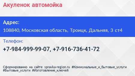 Акуленок, автомойка по адресу 108840, Московская область, Троицк, Дальняя, 3 ст4 в дальнейшем Организация, размещена в следующих категориях: