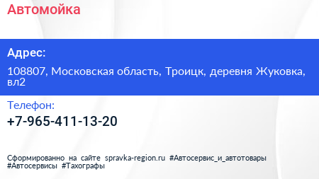 Автомойка по адресу 108807, Московская область, Троицк, деревня Жуковка, вл2 в дальнейшем Организация, размещена в следующих категориях:
