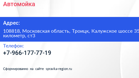 Автомойка по адресу 108818, Московская область, Троицк, Калужское шоссе 35 километр, ст3 в дальнейшем Организация, размещена в следующих категориях: