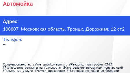 Автомойка по адресу 108807, Московская область, Троицк, Дорожная, 12 ст2 в дальнейшем Организация, размещена в следующих категориях: