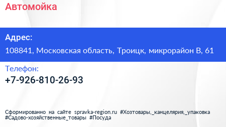 Автомойка по адресу 108841, Московская область, Троицк, микрорайон В, 61 в дальнейшем Организация, размещена в следующих категориях: