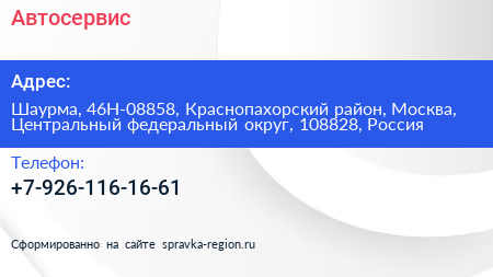 Автосервис по адресу Шаурма, 46Н-08858, Краснопахорский район, Москва, Центральный федеральный округ, 108828, Россия в дальнейшем Организация, размещена в следующих категориях: