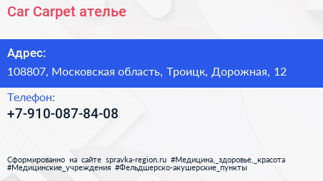 Car Carpet, ателье по адресу 108807, Московская область, Троицк, Дорожная, 12 в дальнейшем Организация, размещена в следующих категориях: