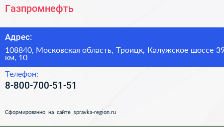 Газпромнефть по адресу 108840, Московская область, Троицк, Калужское шоссе 39 км, 10 в дальнейшем Организация, размещена в следующих категориях: