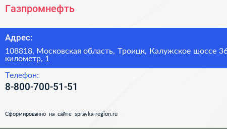 Газпромнефть по адресу 108818, Московская область, Троицк, Калужское шоссе 36 километр, 1 в дальнейшем Организация, размещена в следующих категориях: