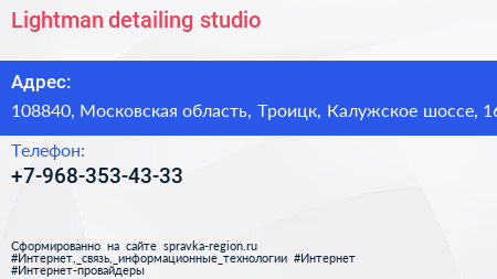 Lightman detailing studio по адресу 108840, Московская область, Троицк, Калужское шоссе, 16 в дальнейшем Организация, размещена в следующих категориях: