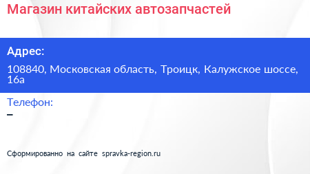 Магазин китайских автозапчастей по адресу 108840, Московская область, Троицк, Калужское шоссе, 16а в дальнейшем Организация, размещена в следующих категориях: