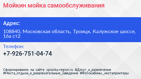 Мойкин, мойка самообслуживания по адресу 108840, Московская область, Троицк, Калужское шоссе, 16а ст2 в дальнейшем Организация, размещена в следующих категориях: