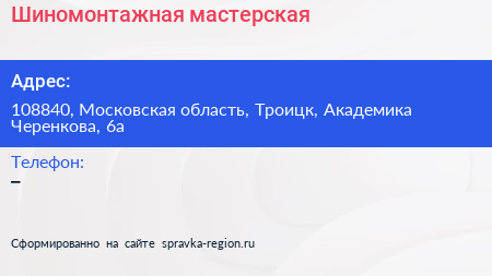 Шиномонтажная мастерская по адресу 108840, Московская область, Троицк, Академика Черенкова, 6а в дальнейшем Организация, размещена в следующих категориях: