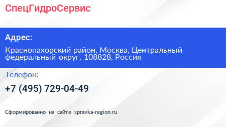 СпецГидроСервис по адресу Краснопахорский район, Москва, Центральный федеральный округ, 108828, Россия в дальнейшем Организация, размещена в следующих категориях: