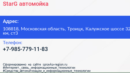 StarG, автомойка по адресу 108818, Московская область, Троицк, Калужское шоссе 32 км, ст3 в дальнейшем Организация, размещена в следующих категориях: