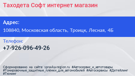 Таходета Софт, интернет-магазин по адресу 108840, Московская область, Троицк, Лесная, 4Б в дальнейшем Организация, размещена в следующих категориях: