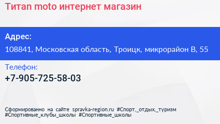 Титаn moto, интернет-магазин по адресу 108841, Московская область, Троицк, микрорайон В, 55 в дальнейшем Организация, размещена в следующих категориях: