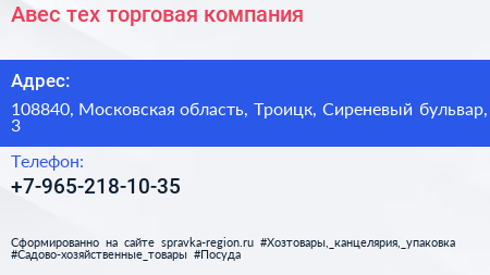 Авес тех, торговая компания по адресу 108840, Московская область, Троицк, Сиреневый бульвар, 3 в дальнейшем Организация, размещена в следующих категориях: