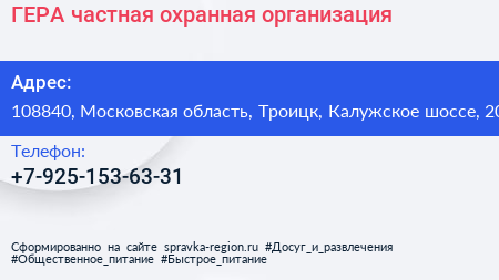 ГЕРА, частная охранная организация по адресу 108840, Московская область, Троицк, Калужское шоссе, 20 в дальнейшем Организация, размещена в следующих категориях: