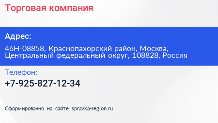 Торговая компания по адресу 46Н-08858, Краснопахорский район, Москва, Центральный федеральный округ, 108828, Россия в дальнейшем Организация, размещена в следующих категориях: