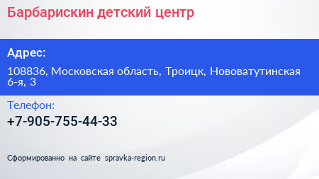 Барбарискин, детский центр по адресу 108836, Московская область, Троицк, Нововатутинская 6-я, 3 в дальнейшем Организация, размещена в следующих категориях: