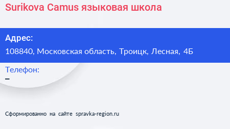 Surikova-Camus, языковая школа по адресу 108840, Московская область, Троицк, Лесная, 4Б в дальнейшем Организация, размещена в следующих категориях: