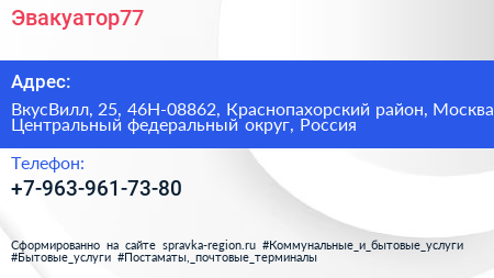 Эвакуатор77 по адресу ВкусВилл, 25, 46Н-08862, Краснопахорский район, Москва, Центральный федеральный округ, Россия в дальнейшем Организация, размещена в следующих категориях: