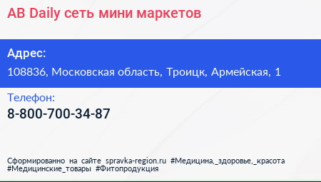 АВ Daily, сеть мини-маркетов по адресу 108836, Московская область, Троицк, Армейская, 1 в дальнейшем Организация, размещена в следующих категориях: