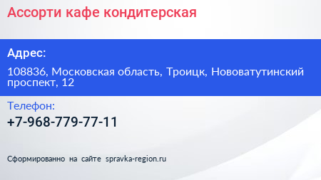 Ассорти, кафе-кондитерская по адресу 108836, Московская область, Троицк, Нововатутинский проспект, 12 в дальнейшем Организация, размещена в следующих категориях: