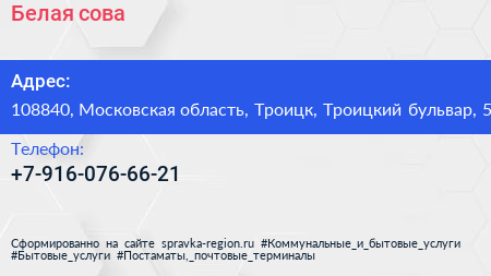 Белая сова по адресу 108840, Московская область, Троицк, Троицкий бульвар, 5 в дальнейшем Организация, размещена в следующих категориях: