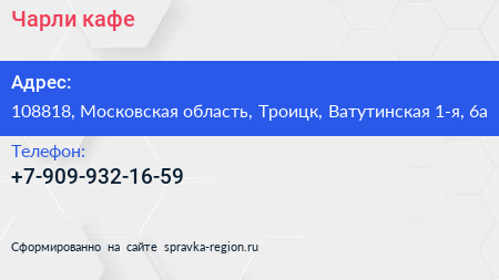 Чарли, кафе по адресу 108818, Московская область, Троицк, Ватутинская 1-я, 6а в дальнейшем Организация, размещена в следующих категориях:
