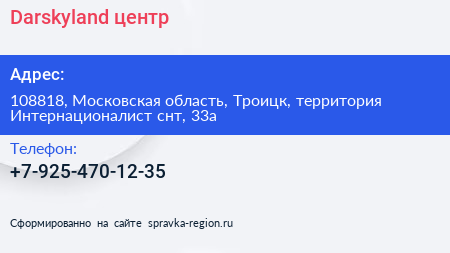 Darskyland, центр по адресу 108818, Московская область, Троицк, территория Интернационалист снт, 33а в дальнейшем Организация, размещена в следующих категориях: