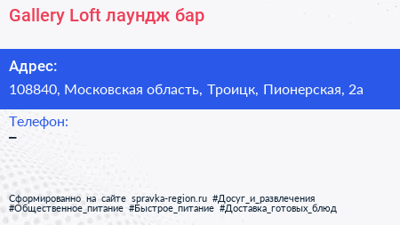 Gallery Loft, лаундж-бар по адресу 108840, Московская область, Троицк, Пионерская, 2а в дальнейшем Организация, размещена в следующих категориях: