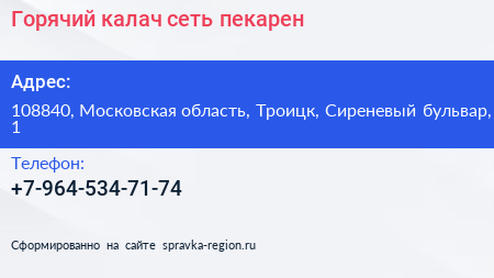 Горячий калач, сеть пекарен по адресу 108840, Московская область, Троицк, Сиреневый бульвар, 1 в дальнейшем Организация, размещена в следующих категориях: