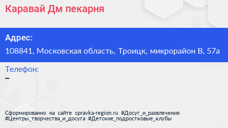 Каравай Дм, пекарня по адресу 108841, Московская область, Троицк, микрорайон В, 57а в дальнейшем Организация, размещена в следующих категориях: