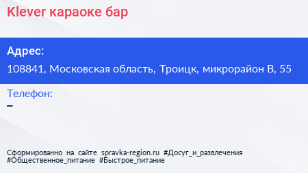 Klever, караоке-бар по адресу 108841, Московская область, Троицк, микрорайон В, 55 в дальнейшем Организация, размещена в следующих категориях: