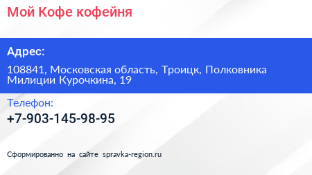Мой Кофе, кофейня по адресу 108841, Московская область, Троицк, Полковника Милиции Курочкина, 19 в дальнейшем Организация, размещена в следующих категориях:
