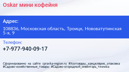 Oskar, мини-кофейня по адресу 108836, Московская область, Троицк, Нововатутинская 5-я, 9 в дальнейшем Организация, размещена в следующих категориях: