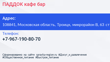 ПАДДОК, кафе-бар по адресу 108841, Московская область, Троицк, микрорайон В, 63 ст1 в дальнейшем Организация, размещена в следующих категориях: