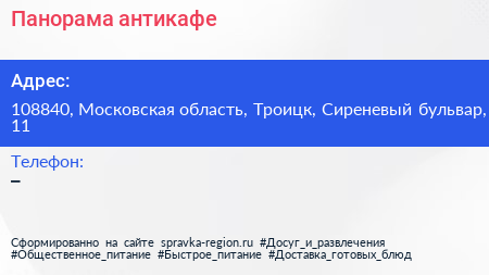 Панорама, антикафе по адресу 108840, Московская область, Троицк, Сиреневый бульвар, 11 в дальнейшем Организация, размещена в следующих категориях: