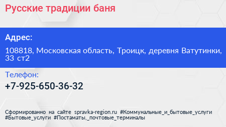 Русские традиции, баня по адресу 108818, Московская область, Троицк, деревня Ватутинки, 33 ст2 в дальнейшем Организация, размещена в следующих категориях: