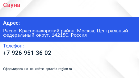 Сауна по адресу Раево, Краснопахорский район, Москва, Центральный федеральный округ, 142150, Россия в дальнейшем Организация, размещена в следующих категориях: