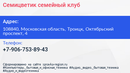 Семицветик, семейный клуб по адресу 108840, Московская область, Троицк, Октябрьский проспект, 4 в дальнейшем Организация, размещена в следующих категориях: